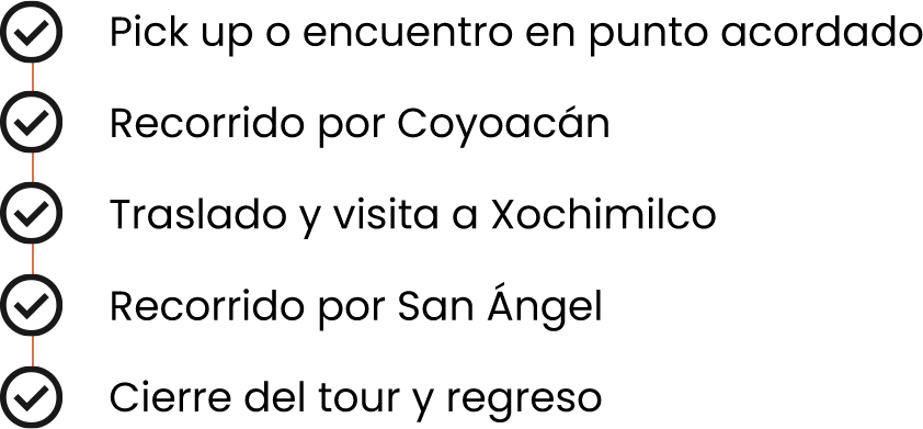 Comenzaremos explorando Coyoacán, con sus calles empedradas, plazas y ambiente bohemio. Continuaremos hacia Xochimilco, reconocido por sus canales y su importancia cultural, donde conocerás el origen y significado de esta zona única. Finalizaremos en San Ángel, un barrio histórico conocido por su arquitectura colonial y su atmósfera tranquila.