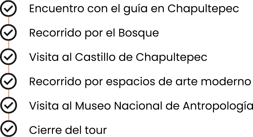 A lo largo del recorrido visitarás el Castillo de Chapultepec, conocerás espacios dedicados al arte moderno y finalizarás con una visita guiada al Museo Nacional de Antropología, uno de los museos más importantes de América Latina.